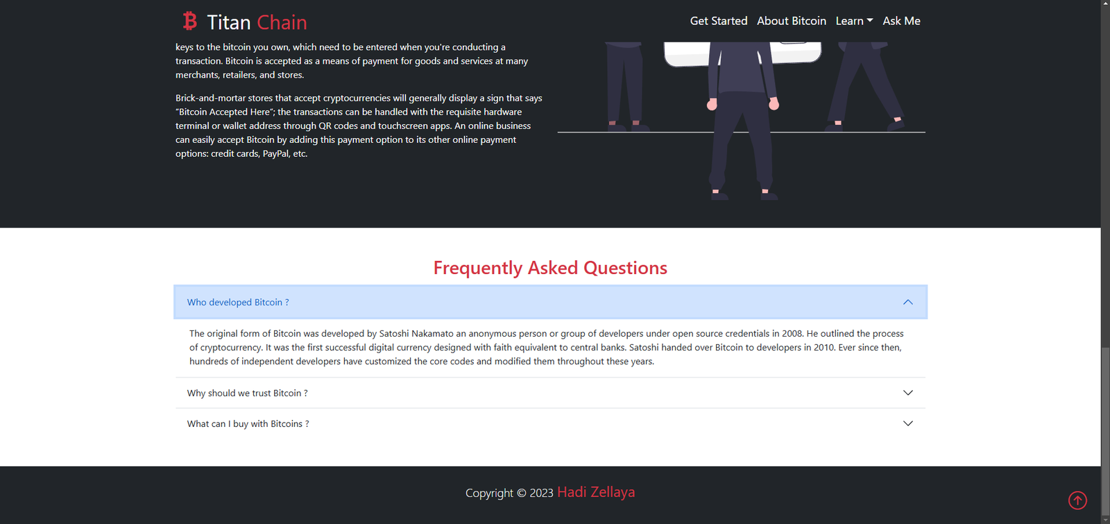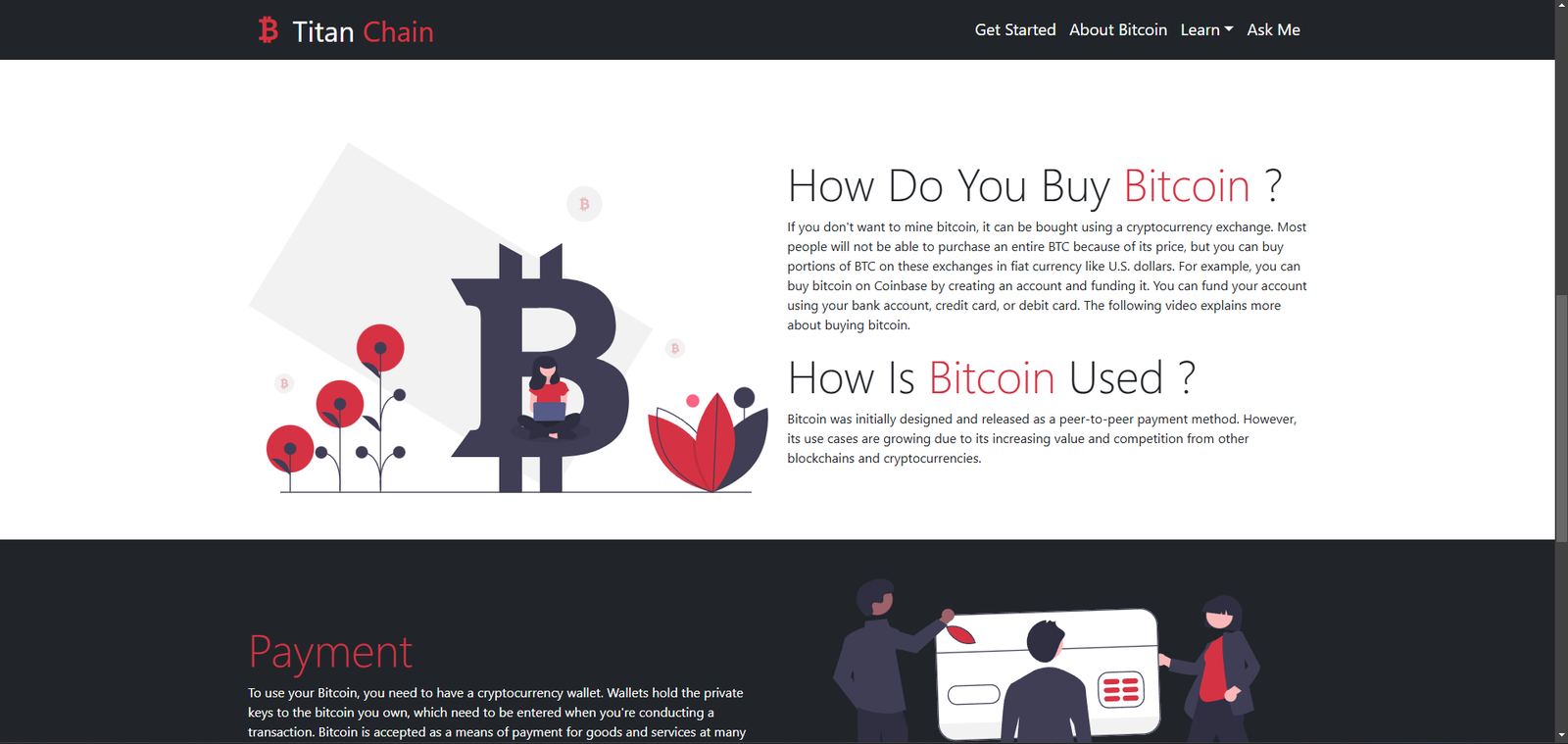 This project was built for a client who is a university student, he needed it for his graduation project, i built using html, css, javascript, its a simple website about bitcoin information, history and best ways to invest in it, but his teachers where impressed by the design and smoothness of the project.